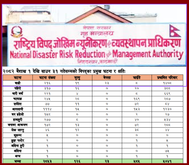 वैशाखदेखि हालसम्म देशभर दुई हजार ८ सय ५३ विपद्का घटना